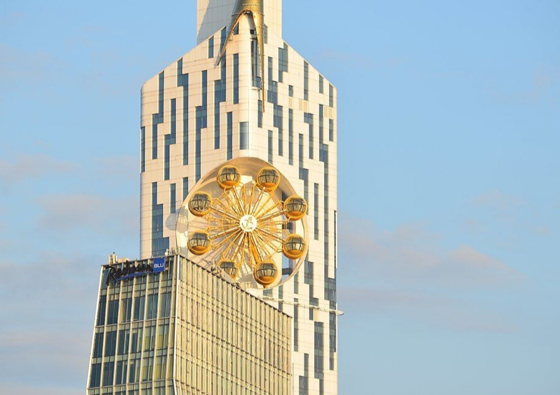 La grande roue d’or est située au 27e étage d’un gratte-ciel de 36 étages qui devait abriter l’Université technologique de la mer Noire, mais elle n’a jamais été ouverte. Sa place a pris l’hôtel cinq étoiles. Le bâtiment lui-même est très inhabituel : la disposition des fenêtres est similaire au jeu de Tetris, et une corne d’or se trouve au-dessus.